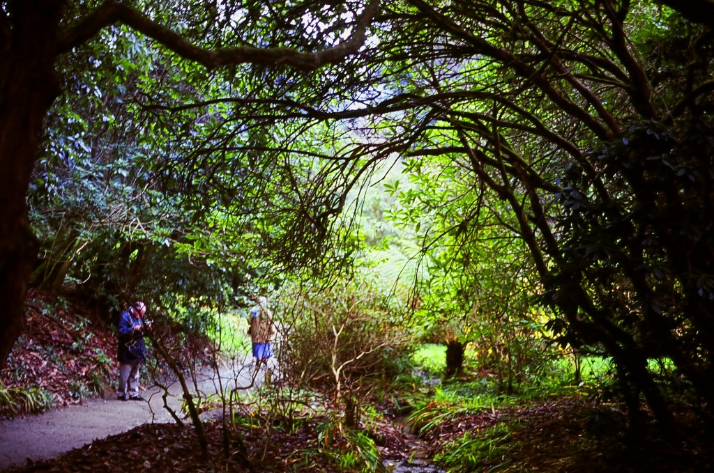 The water fall in the Tropical Biome at the Eden Prodject at Bedelva in Cornwall sandwiched between two photographs of Trebah Gardens near Falmouth in Cornwall.